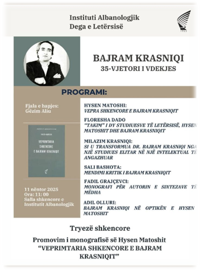 Në 35-vjetorin e vdekjes së Bajram Krasniqit, Instituti Albanologjik Dega e Letërsisë promovon monografinë e Dr. Hysen Matoshit “Veprimtaria shkencore e Bajram Krasniqit”, e cila në brendësinë e saj ka një studim të gjerë për jetën dhe veprën e intelektualit të shquar të Bajram Krasniqit, njërit ndër figurat e rëndësishme të kritikës dhe studimeve letrare shqiptare.
