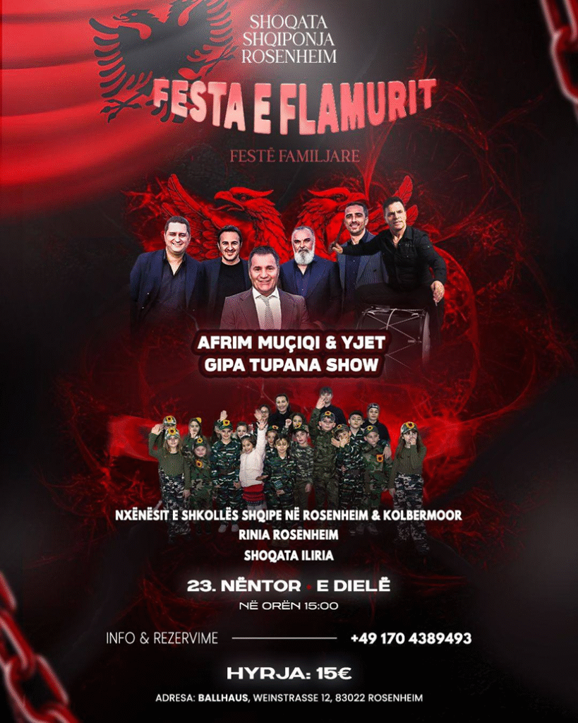 Shoqata “Shqiponja” në Rosenheim për nder të 28 Nëntorin – Ditës së Flamurit, ka organizuar një program kulturo-artistike me recitime, këngë dhe valle. Në këtë event të ftuar janë të gjithë bashkëkombasit, që së bashku të jehoj gëzimi për festën tonë kombëtare.